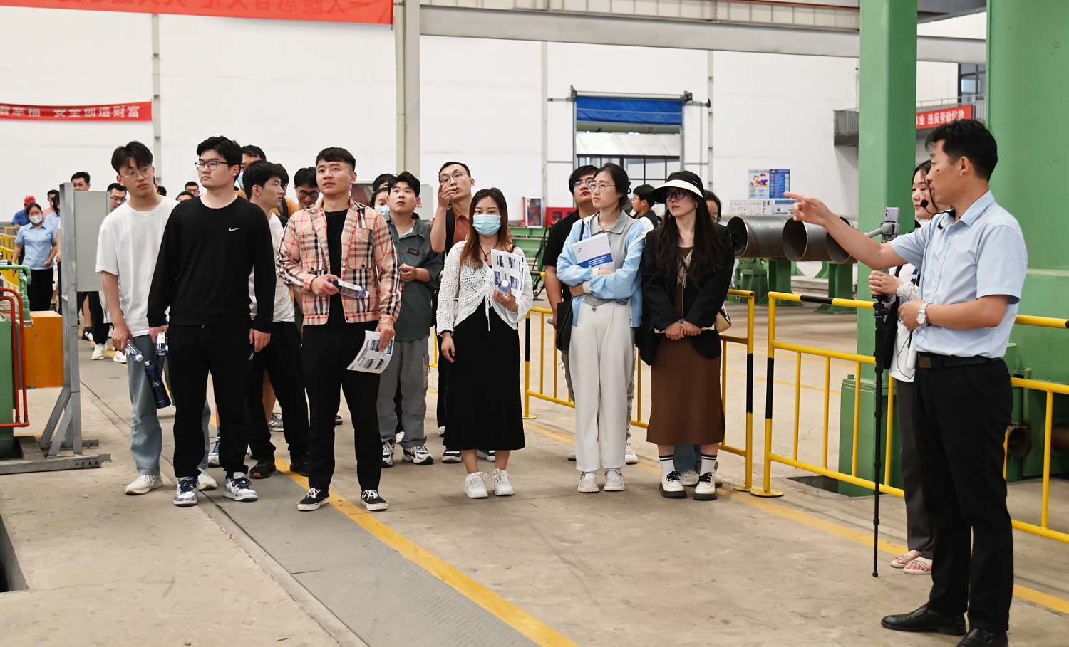 ? ? ? ?緊接著,前去游玩PPH成品庫與錐形焊接鋼管成品庫來當場參觀考察,給水管平臺副總裁為煙臺技術學校的學子們具體介紹書了的產品的制作工藝具體流程。
